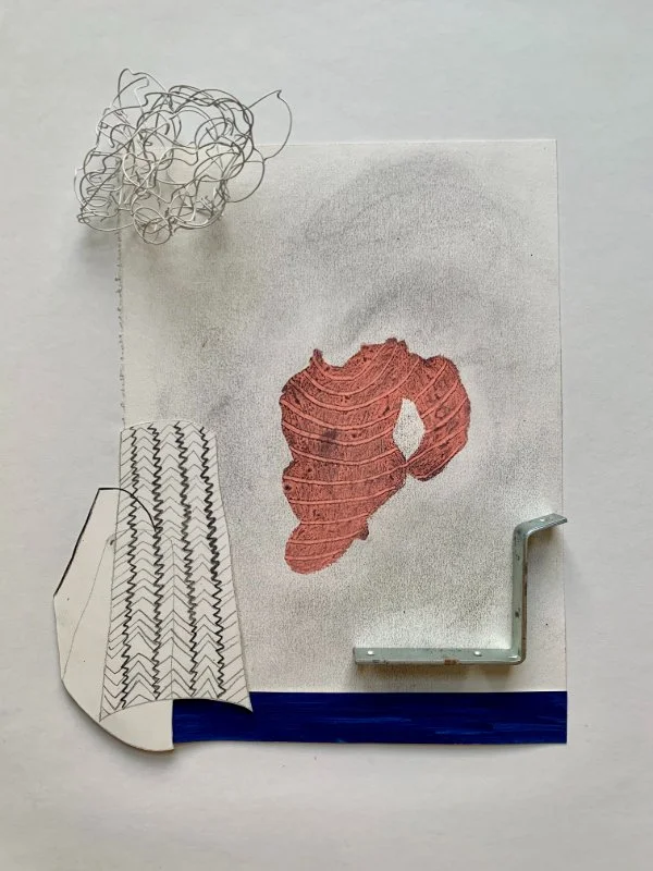 Image: Emily Lindskoog, Tongue Tie, Oil pastel, charcoal, acrylic, collage, an L bracket from an old project and the metal spiral binding from a former student’s drawing pad, 17 x 13 inches