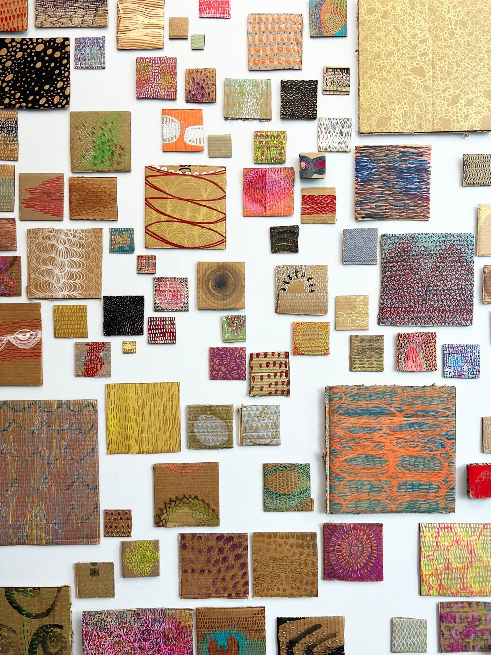 The project began in May of 2020 during lockdown, following the birth of Debra’s second child, when an accumulation of delivery boxes became a studio resource. What started as “crappy art on crappy cardboard,” made in brief moments between caregiving, has continued as a sustained practice. Through both sudden loss, including the death of her brother, and personal gains, such as finding steadiness and purpose in a family and a profession she loves, Debra uses small gestures to make a web of interactions.