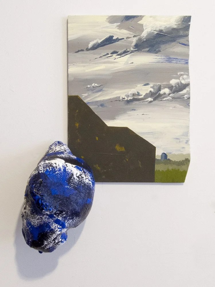 The entry point to this work is the landscape of suburban, semi-public spaces: lawns, ponds, skies and flora, planned and invasive, that surround office and industrial complexes. Gorchov paints these elements with varying degrees of specificity, allowing image to collide, dissolve into and be convoluted by painterly gestural abstraction. The paint inhabits geometric and organic three-dimensional forms that hang on the wall, inviting gravity to a wrestling match with balance. The forms work in concert to frame and obscure, defamiliarizing omnipresent, ordinary environments.