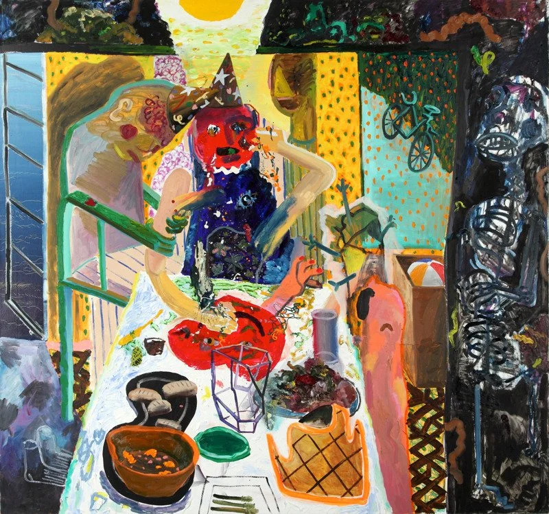 Paintings have long used a meal or a gathering as a stage to show lives unfolding. It seems logical. We are organized by what sustains us: light, heat, food and community. So we congregate for meals and meetings and our lives unfold as we nourish ourselves. At the table we do our best to pull it together and relate to one another before heading our separate ways.