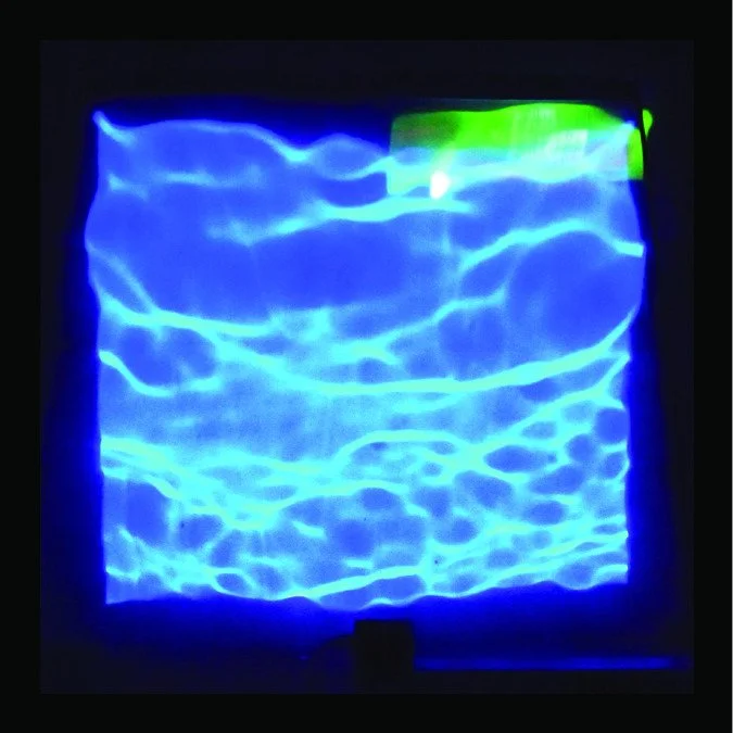 The two artists met at a residency in Iowa where they were both fascinated by the area’s vast landscape and its overwhelming effect on the senses. The installation recalls that all-consuming experience by emulating the sensory properties of the Midwestern winds. With audio culled from jet turbines and helicopter blades, Braidwood’s field recordings are interpreted and remixed by Masch through the use of speakers and projected light. Air pressure oscillates between physical vibration, audible sound, and visual representation, creating an atmosphere in which the observer becomes immersed in sensory experience.